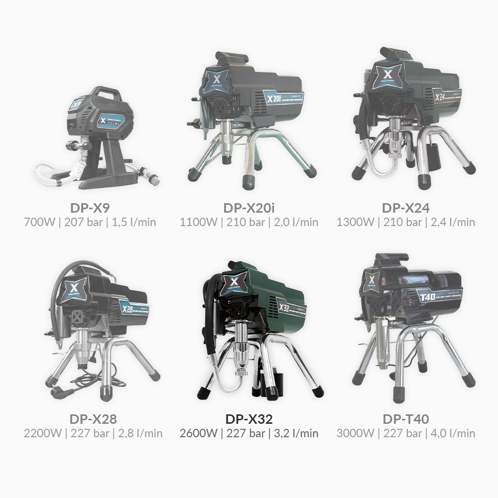 DinoPower X32 to profesjonalny, tłokowy agregat malarski bezpowietrzny dla wykonawców realizujących regularne prace malarskie. Dzięki wydajności 3,2 l/min i pompie z ceramicznym tłokiem urządzenie zapewnia stabilny natrysk i długą żywotność nawet przy intensywnej eksploatacji.