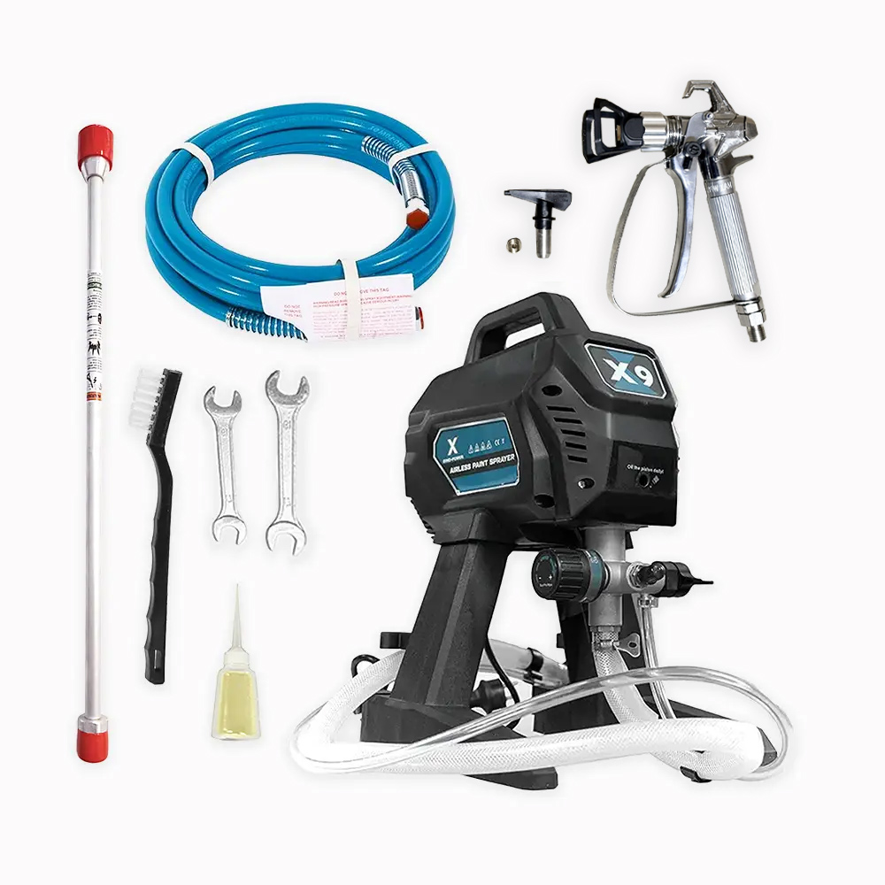 ⚠️ Ograniczenia: model X9 nie nadaje się do farb gęstych, strukturalnych, mas szpachlowych ani farb na bazie rozpuszczalnika. Do takich zastosowań wymagane są mocniejsze agregaty z większą pompą i dyszą.