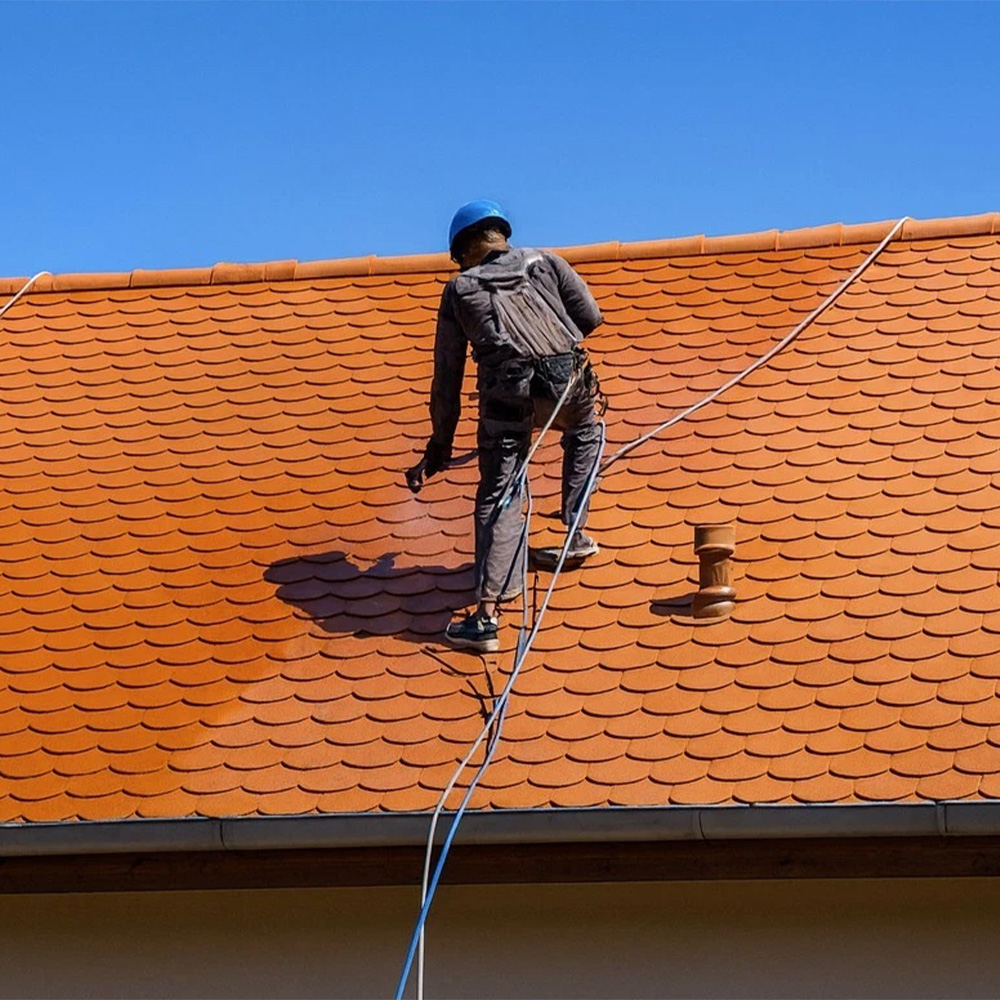 1. Przygotowanie podłoża: Powierzchnię dachu należy umyć myjką ciśnieniową z użyciem preparatu Dach-Sauber. Przed impregnacją dachówka musi być całkowicie czysta i sucha.
